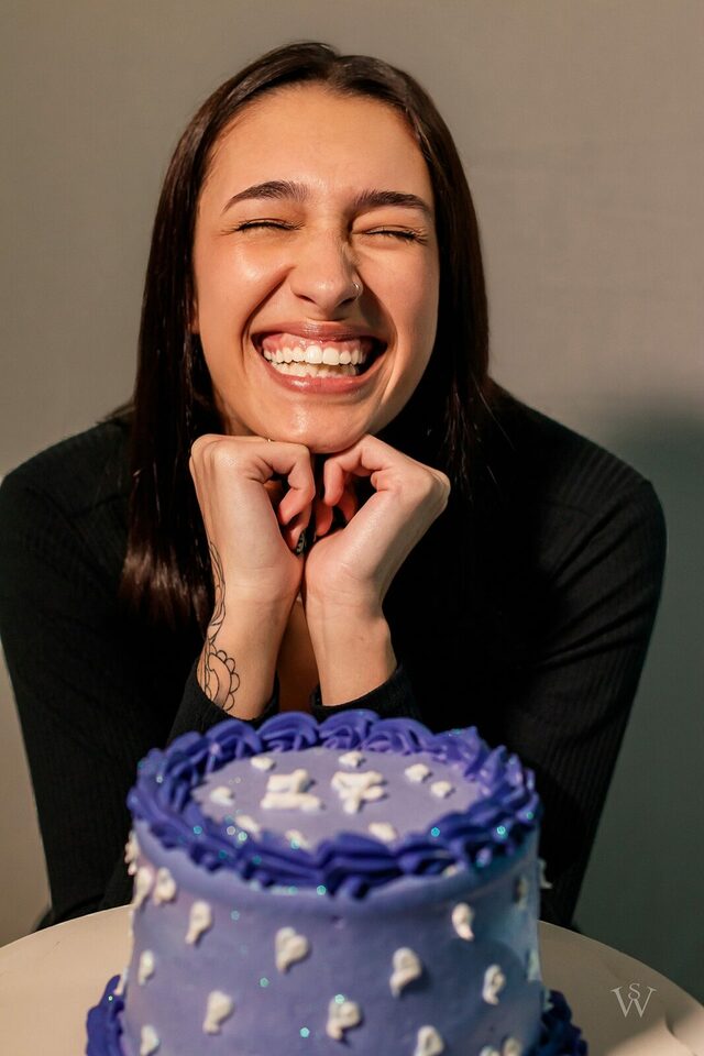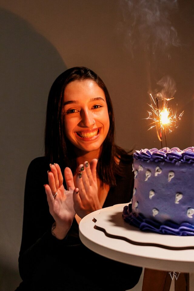 Fizemos cliques em pé, no chão, com acessório, com o bolo do aniversário e até experimentamos misturar fumaça de incenso com luzes coloridas. Cada ideia que surgia, eu propunha — e ela topava!
