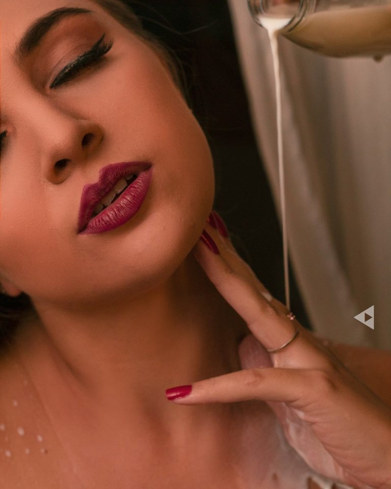 Toda esta conexão a ajudou a tomar a decisão que seria um ensaio sensual que faria. Escolhemos a Casa Larentis como cenário, tomamos uma dose reforçada de inspiração para o dia e o ambiente que tivemos foi o melhor possível - desde a foto com vinho que ela gosta até o derramamento de leite na banheira no fim do ensaio.