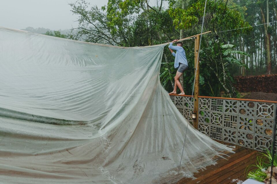 Recolhe tudo para tirar da chuva, tira lona fora, limpa a água e pedras acumuladas no deck e não tem jeito: teremos que executar o plano B!