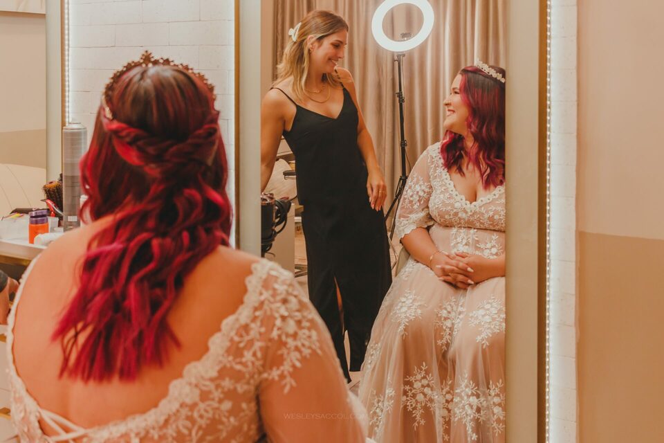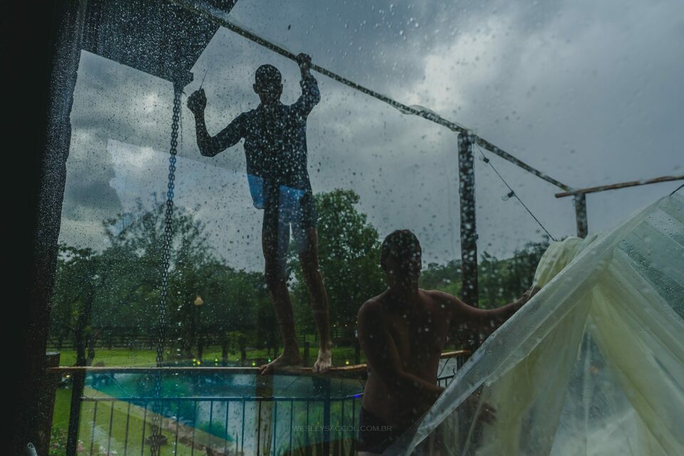 Na mesma proporção que acontecia o making-of, acontecia a virada do tempo lá fora! Escureceu tanto o céu e, em poucos minutos, o temporal veio com vento e granizo, ocasionando uma mudança brusca no planejamento do casamento.