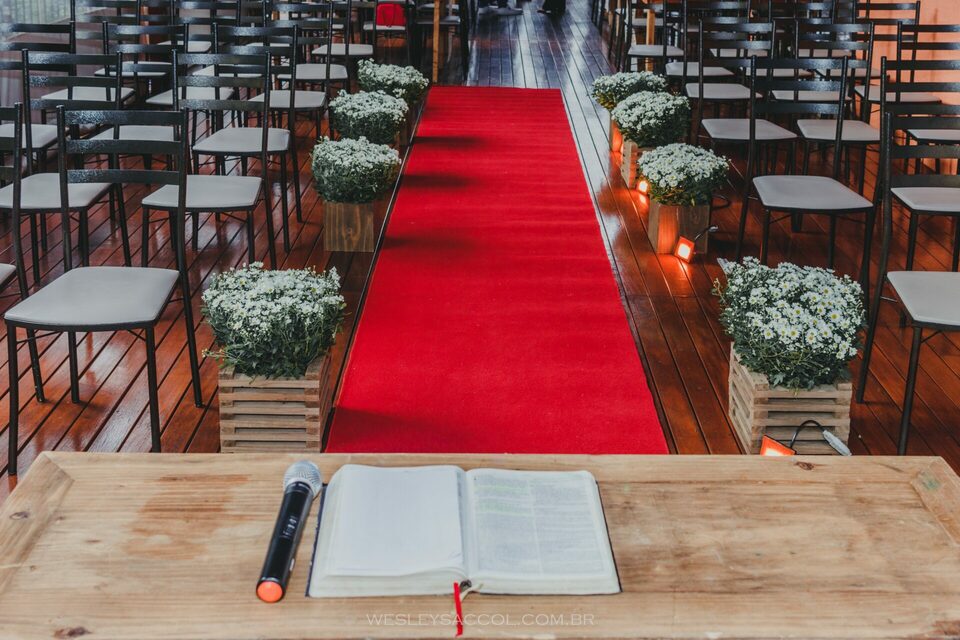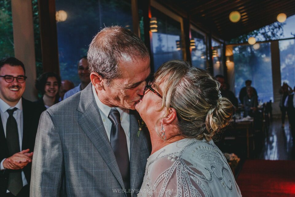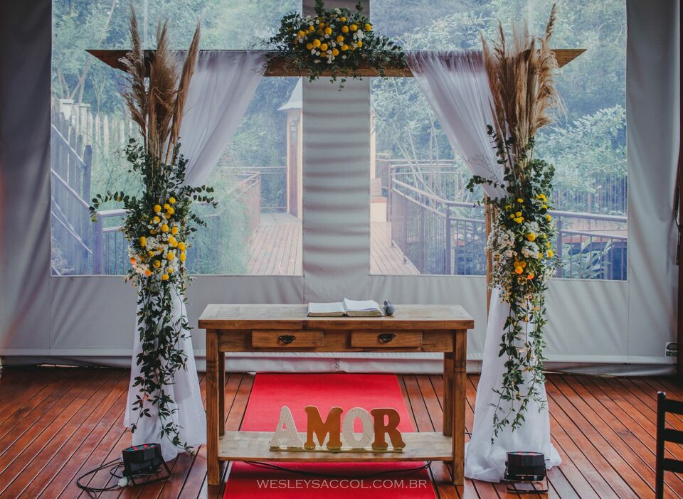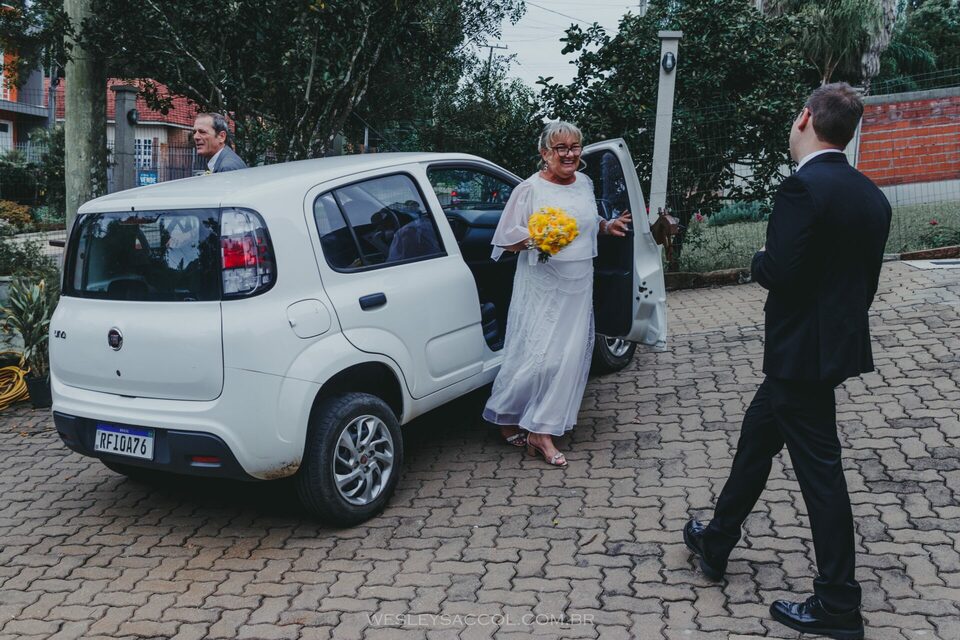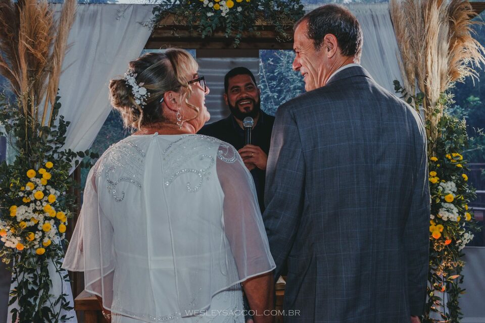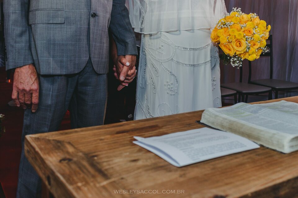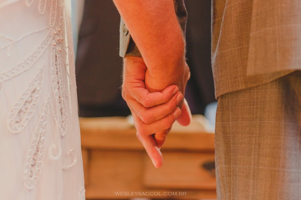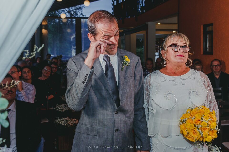 Eis que chega o 30 de abril de 2022 e com ele o friozinho na barriga, a expectativa, a alegria também! O dia estava nublado e com possibilidade de chuva e um friozinho típico do outono gaúcho, mas nada capaz de tirar o brilho dos dois. Eles vieram diretamente do hotel e chegaram alguns minutos depois das 17 horas (para não perder a tradição de deixar os convidados e fotógrafo na expectativa, sabe? Hehe). Entraram juntos, percorreram o tapete vermelho e se posicionaram em frente ao celebrante para um momento de grande emoção.